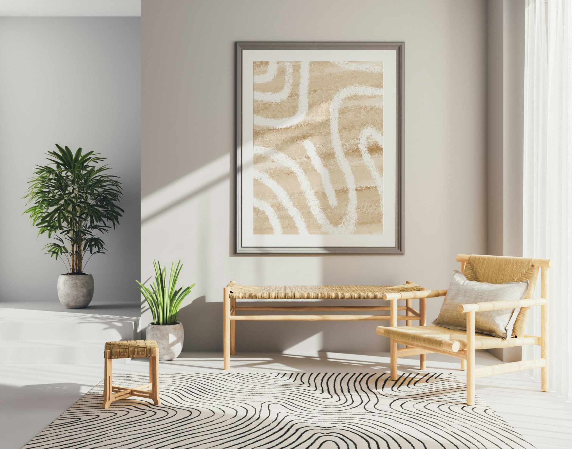 - Farvetoner: Beige og hvid skaber et roligt og afbalanceret look.